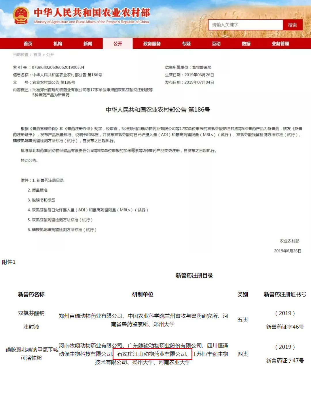 近日,農(nóng)業(yè)部下發(fā)第186號公告,批準(zhǔn)石家莊江山動物藥業(yè)參與研發(fā)的“磺胺氯吡嗪鈉甲氧芐啶可溶性粉為國家四類新獸藥(新獸藥注冊證書號(2019)新獸藥證字47號)