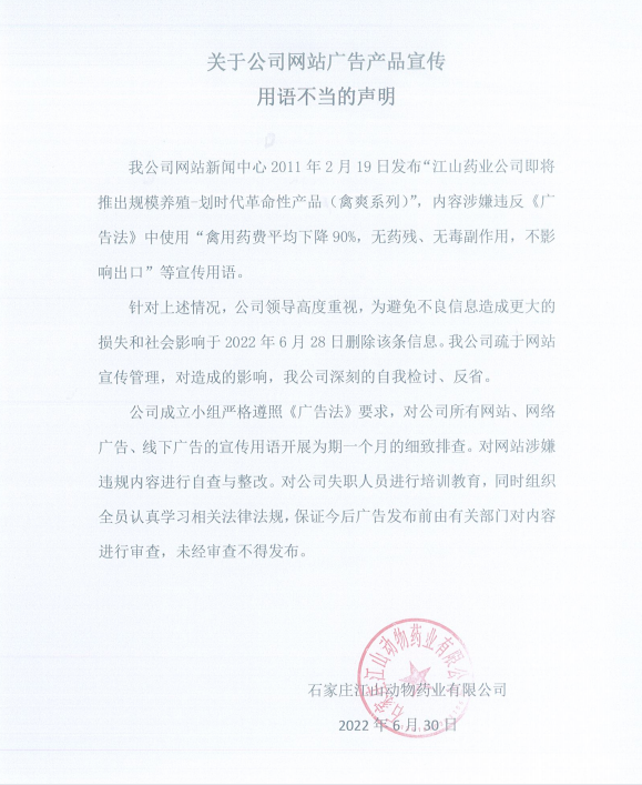 我公司網(wǎng)站新聞中心2011年2月19日發(fā)布“江山藥業(yè)公司即將推出規(guī)模養(yǎng)殖-劃時(shí)代革命性產(chǎn)品(禽爽系列)”,內(nèi)容涉嫌違反《廣告法》中使用“禽用藥費(fèi)平均下降90%,無(wú)藥殘、無(wú)毒副作用,不影響出口”等宣傳用語(yǔ)。